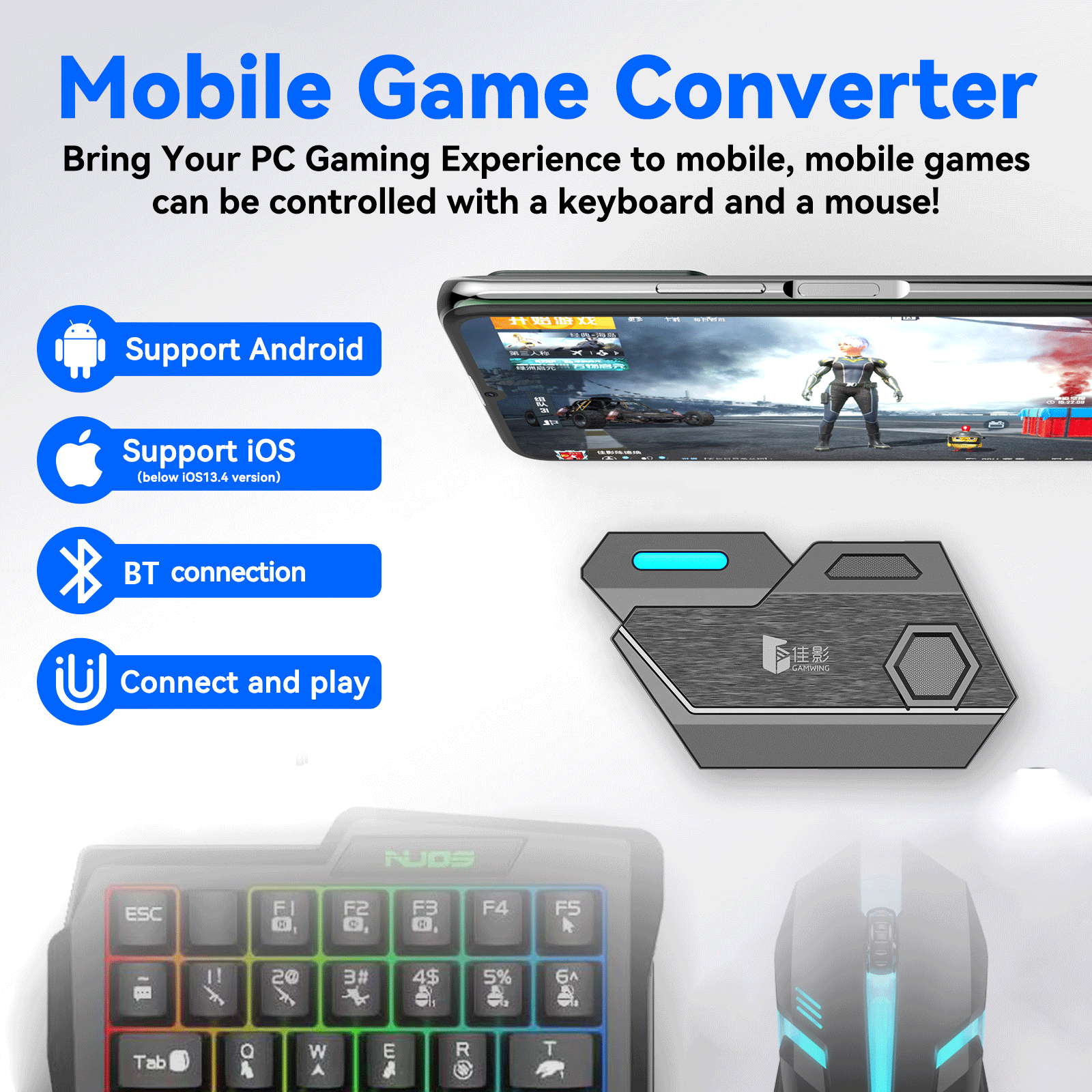 1.Match mobile phone players, safe to use without the risk of losing ID permission.2.Bluetooth 4.2 intelligent connection mode, faster connection.3.Support all pressure , stable to work.4.Support mouse roller to zoom map.5.No lag, no latency.6.Compatible with Android and lOS dual platforms, matching players using touch screen devices.